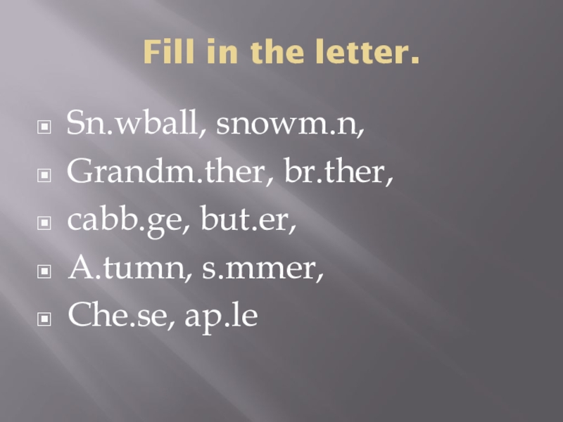 Fill in the letter.Sn.wball, snowm.n,Grandm.ther, br.ther,cabb.ge, but.er,A.tumn, s.mmer,Che.se, ap.le