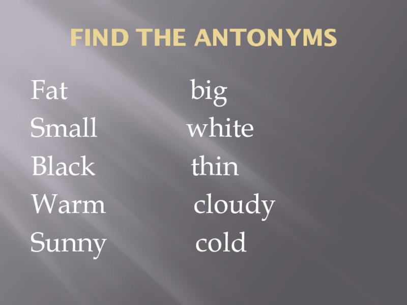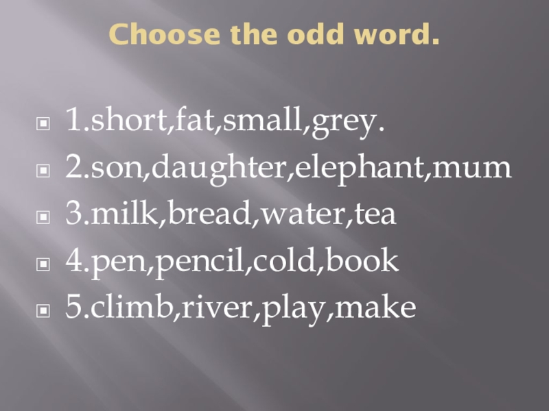 Choose the odd word. 1.short,fat,small,grey.2.son,daughter,elephant,mum3.milk,bread,water,tea4.pen,pencil,cold,book5.climb,river,play,make