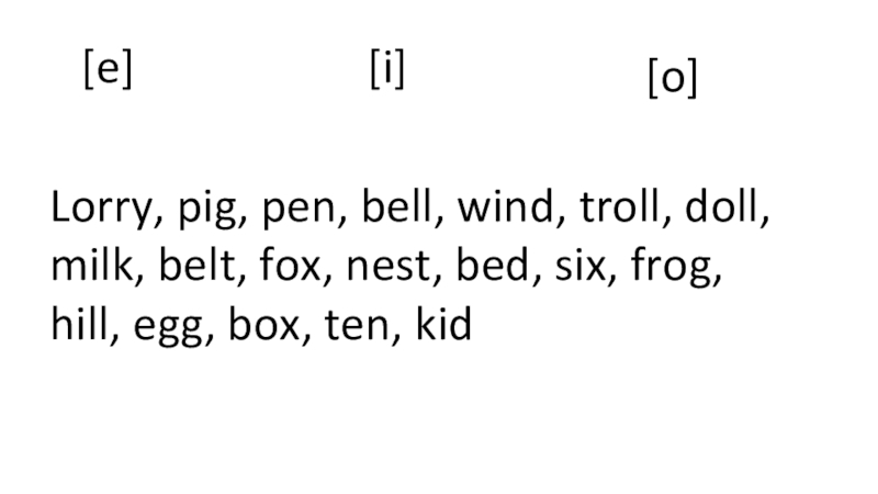 [e][i][o]Lorry, pig, pen, bell, wind, troll, doll, milk, belt, fox, nest, bed, six, frog, hill, egg, box,