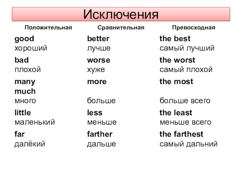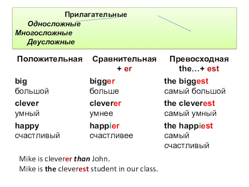 Прилагательные 	Односложные    											Многосложные 	ДвусложныеMike is cleverer than John.Mike is the cleverest student in our