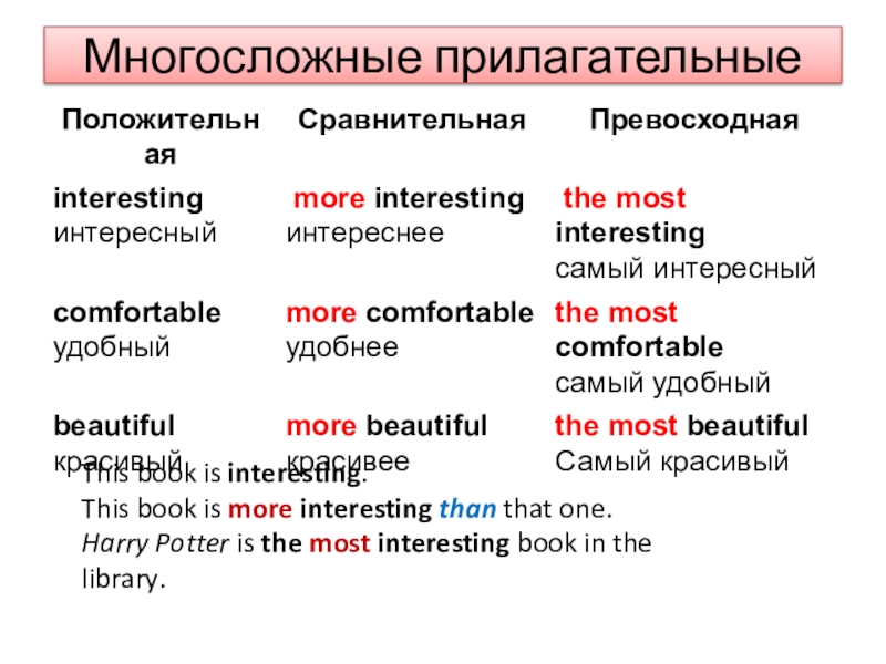 Многосложные прилагательныеThis book is interesting.This book is more interesting than that one.Harry Potter is the most interesting