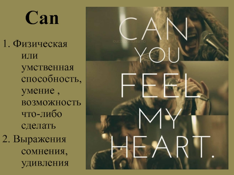 Can 1. Физическая или умственная способность, умение , возможность что-либо сделать2. Выражения сомнения, удивления