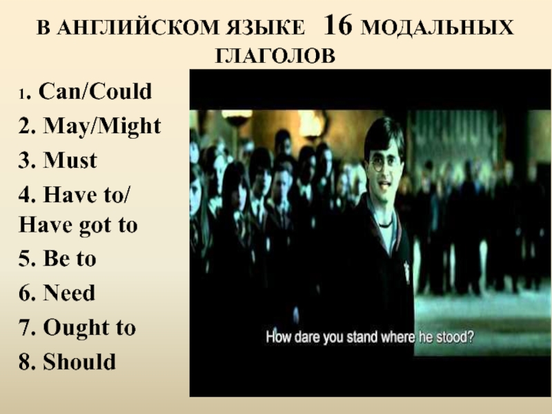 В АНГЛИЙСКОМ ЯЗЫКЕ  16 МОДАЛЬНЫХ ГЛАГОЛОВ 1. Can/Could2. May/Might3. Must4. Have to/ Have got to5. Be