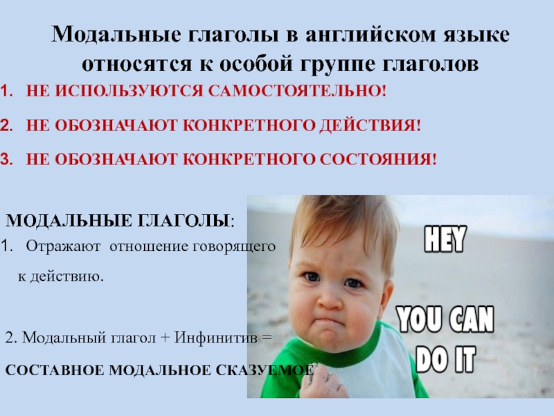 Модальные глаголы в английском языке относятся к особой группе глаголовНЕ ИСПОЛЬЗУЮТСЯ САМОСТОЯТЕЛЬНО!НЕ ОБОЗНАЧАЮТ КОНКРЕТНОГО ДЕЙСТВИЯ!НЕ ОБОЗНАЧАЮТ КОНКРЕТНОГО СОСТОЯНИЯ!МОДАЛЬНЫЕ ГЛАГОЛЫ:Отражают отношение говорящего к действию.2. Модальный глагол + Инфинитив = СОСТАВНОЕ МОДАЛЬНОЕ СКАЗУЕМОЕ