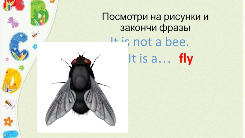Посмотри на рисунки и закончи фразыIt is not a bee. It is a…fly