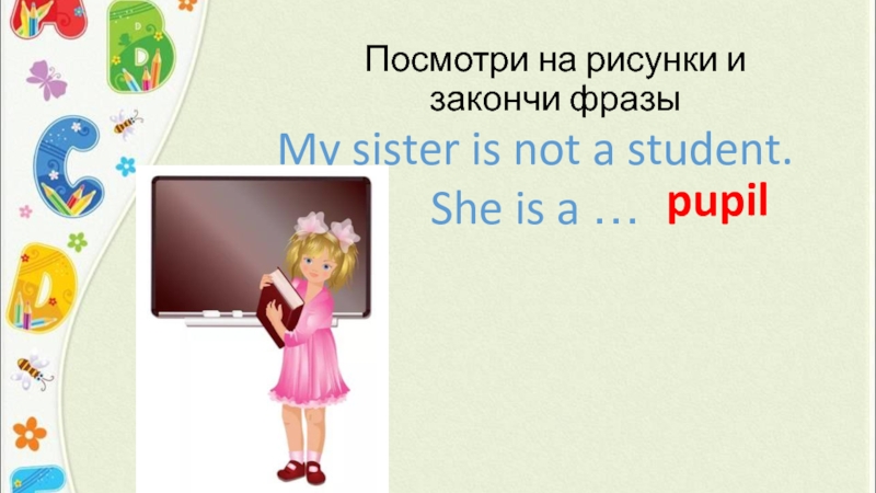 Посмотри на рисунки и закончи фразыMy sister is not a student. She is a …pupil
