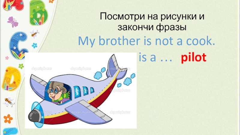 Посмотри на рисунки и закончи фразыMy brother is not a cook. He is a …pilot