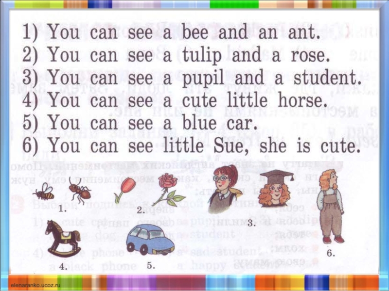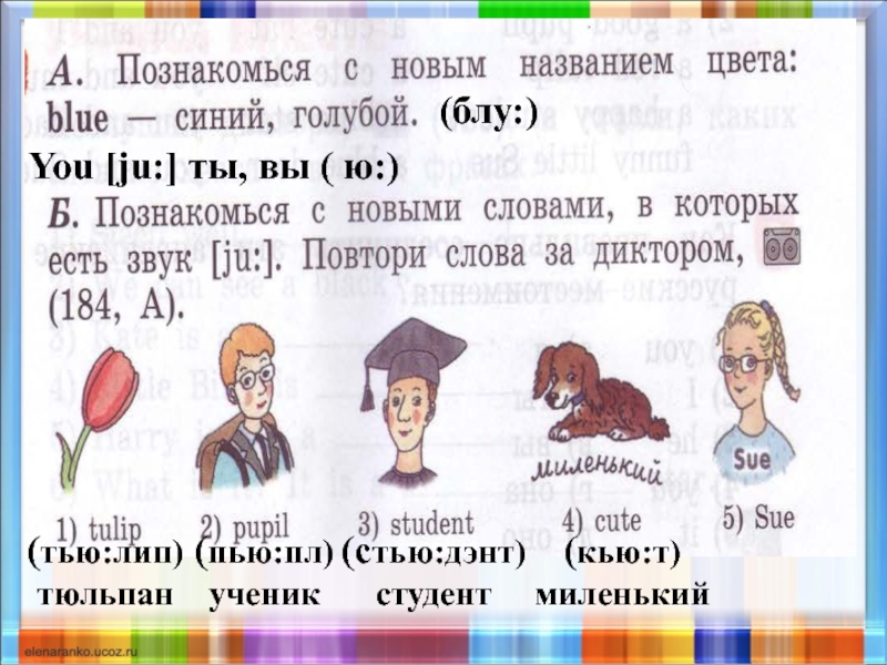 Запиши новые слова.(блу:)(тью:лип)тюльпан(пью:пл)ученик(стью:дэнт)студент(кью:т)миленькийYou [ϳu:] ты, вы ( ю:)