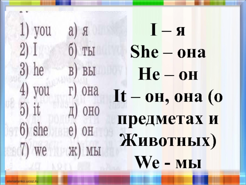 I – яShe – онаHe – онIt – он, она (о предметах и Животных)We - мы