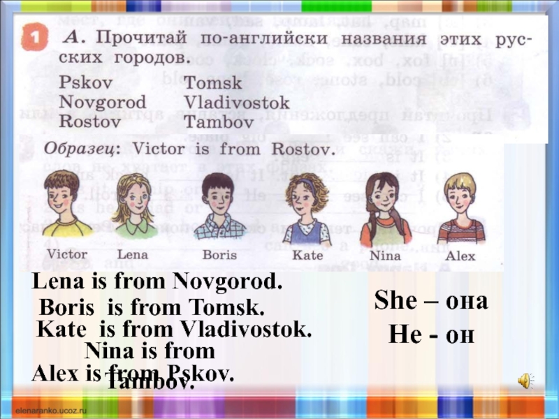 Lena is from Novgorod.Boris is from Tomsk.Kate is from Vladivostok.Nina is from Tambov.Alex is from Pskov.She – онаHe - он