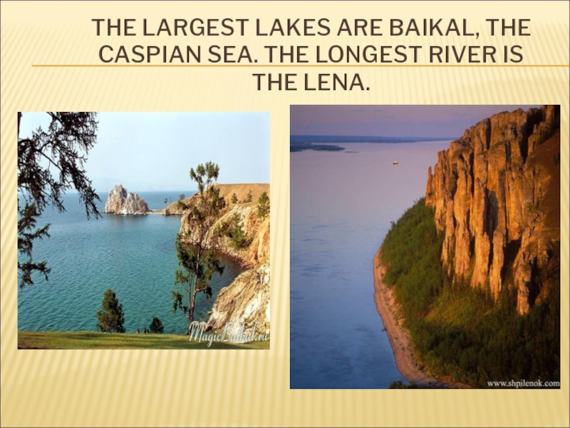 Слайд 8THE LARGEST LAKES ARE BAIKAL, THE CASPIAN SEA. THE LONGEST RIVER