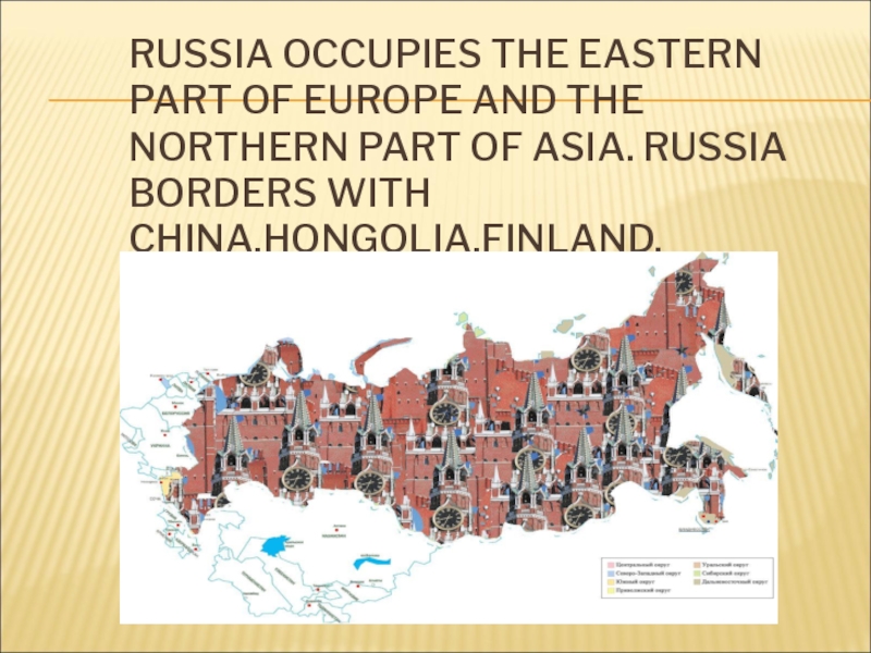 RUSSIA OCCUPIES THE EASTERN PART OF EUROPE AND THE NORTHERN PART OF ASIA. RUSSIA BORDERS WITH CHINA,HONGOLIA,FINLAND.