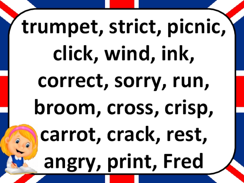 trumpet, strict, picnic, click, wind, ink, correct, sorry, run, broom, cross, crisp, carrot, crack, rest, angry, print, Fred