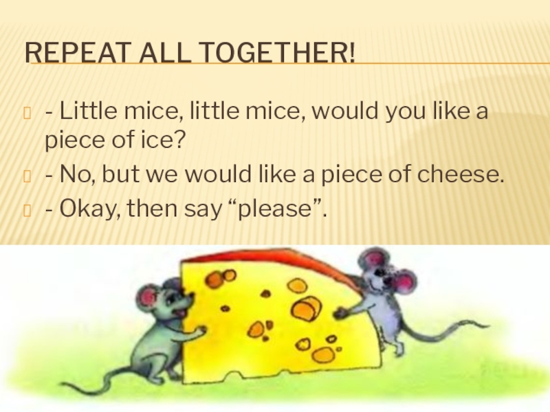 Repeat all together!- Little mice, little mice, would you like a piece of ice?- No, but we