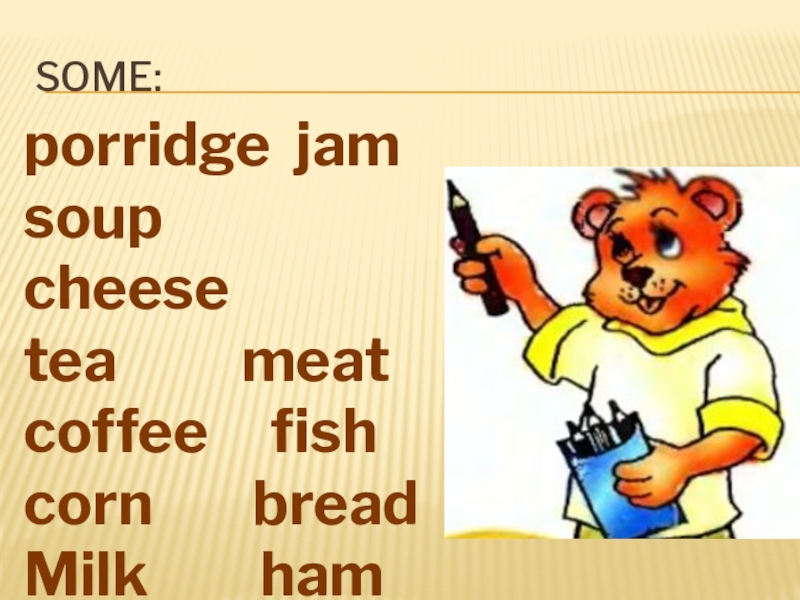 SOME:porridge jamsoup   cheesetea     meatcoffee   fishcorn    breadMilk