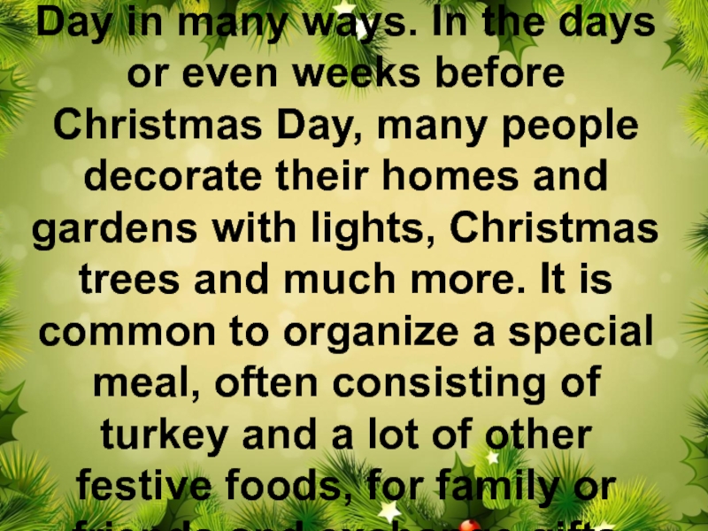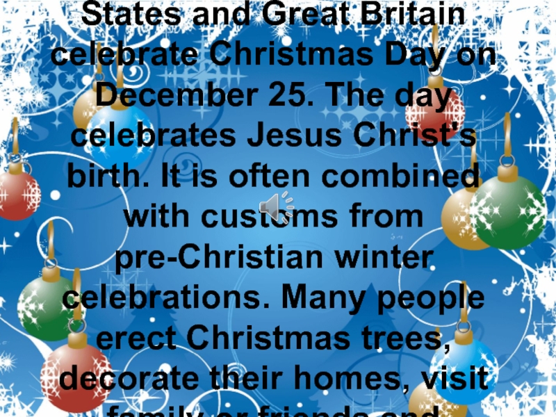 Day on December 25. The day celebrates Jesus Christ's birth. It is often combined with customs from pre-Christian winter celebrations. Many people erect Christmas trees, decorate their homes, visit family or friends and exchange gifts.