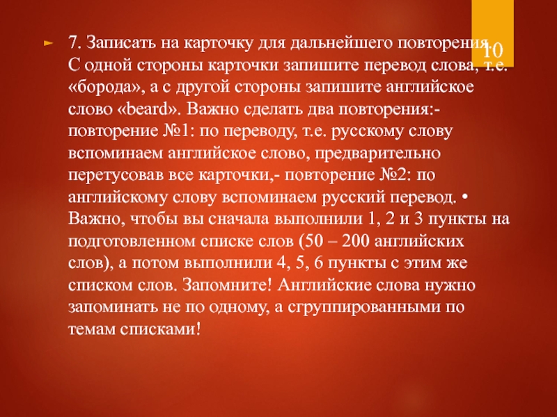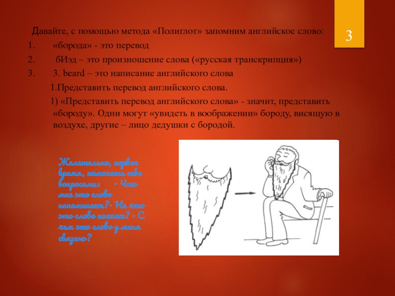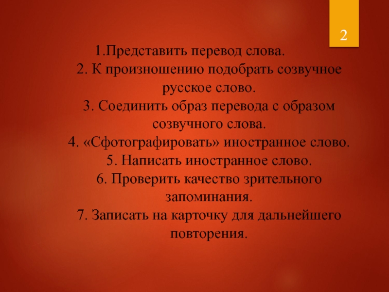 Желательно, первое время, помогать себе вопросами: - Что мне это слово напоминает?- На что это слово похоже? - С чем это слово у меня связано?