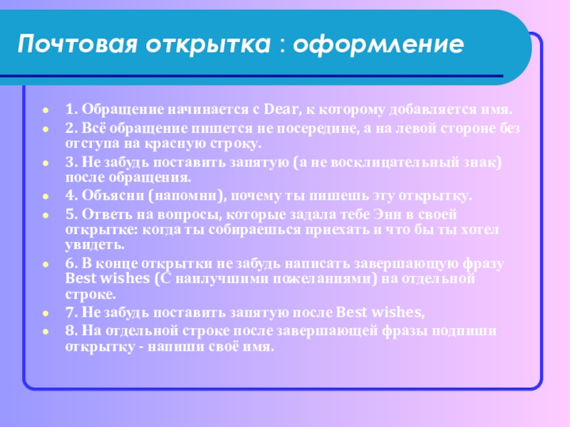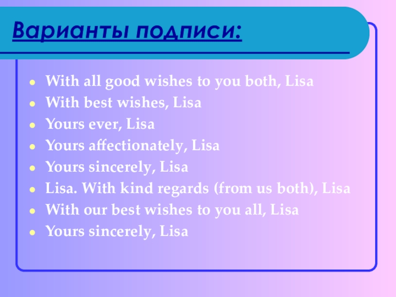 6. В конце открытки не забудь написать завершающую фразу Best wishes (С наилучшими пожеланиями) на отдельной строке.
