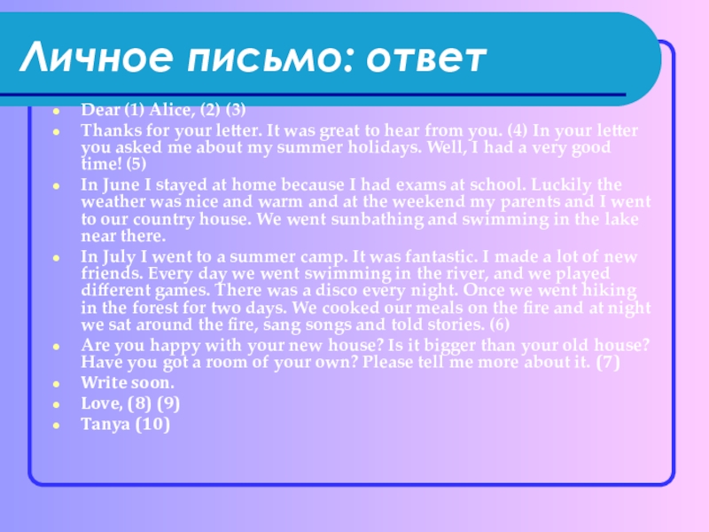 It was great to hear from you. (4) In your letter you asked me about my summer holidays. Well, I had a very good time! (5)