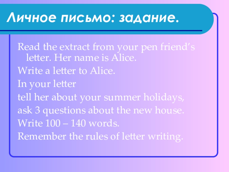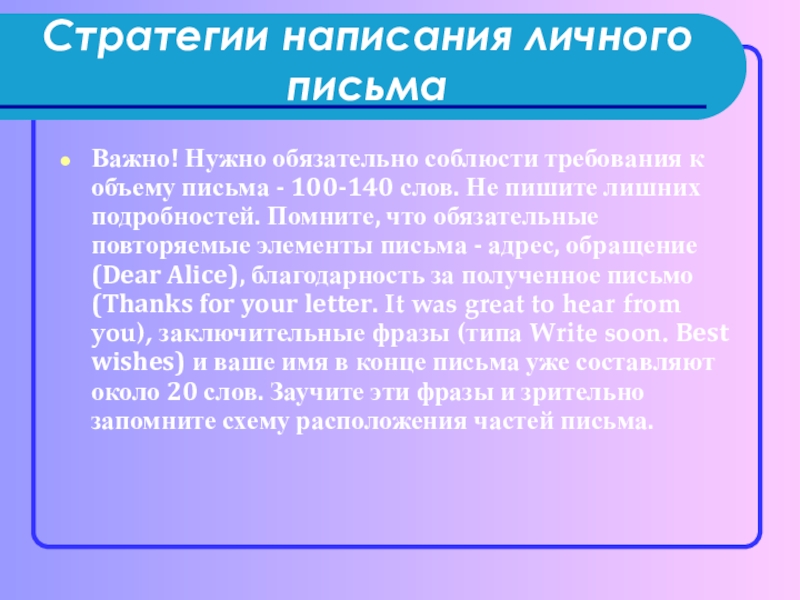 письма - 100-140 слов. Не пишите лишних подробностей. Помните, что обязательные повторяемые элементы письма - адрес, обращение (Dear Alice), благодарность за полученное письмо (Thanks for your letter. It was great to hear from you), заключительные фразы (типа Write soon. Best wishes) и ваше имя в конце письма уже составляют около 20 слов. Заучите эти фразы и зрительно запомните схему расположения частей письма.