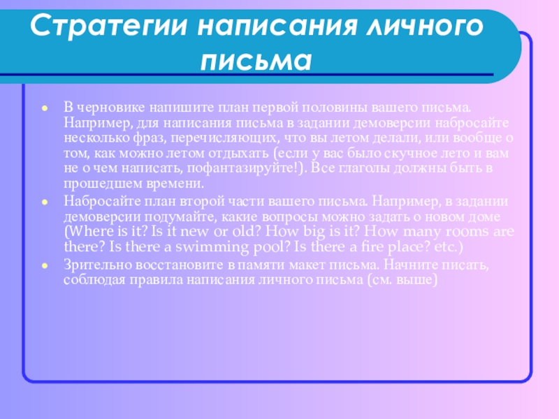 Например, для написания письма в задании демоверсии набросайте несколько фраз, перечисляющих, что вы летом делали, или вообще о том, как можно летом отдыхать (если у вас было скучное лето и вам не о чем написать, пофантазируйте!). Все глаголы должны быть в прошедшем времени.