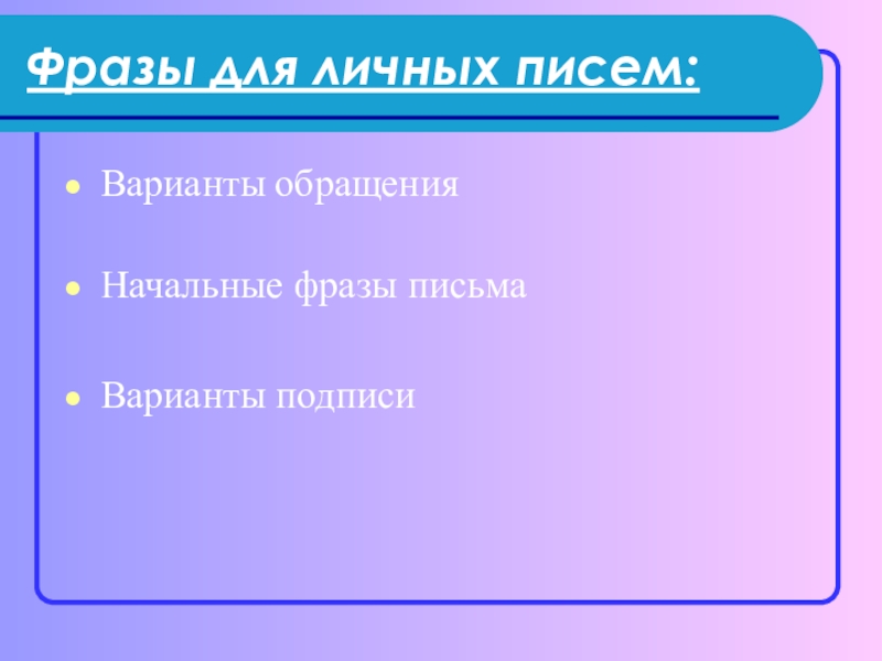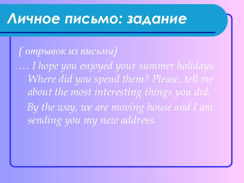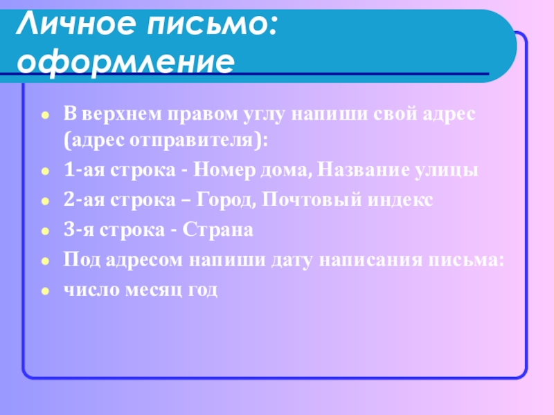 Зрительно восстановите в памяти макет письма. Начните писать, соблюдая правила написания личного письма (см. выше)