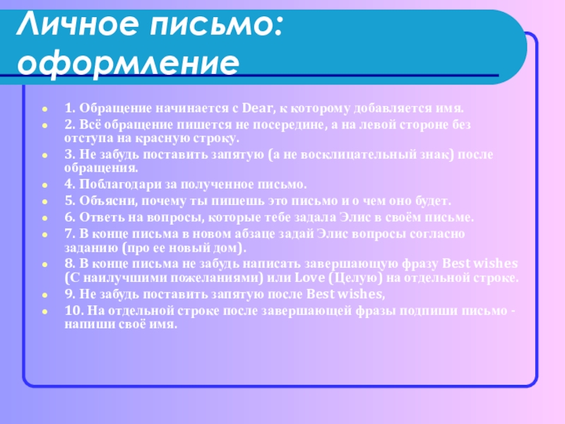 10. На отдельной строке после завершающей фразы подпиши письмо - напиши своё имя.
