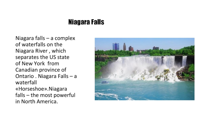 Niagara River , which separates the US state of New York from Canadian province of Ontario . Niagara Falls – a waterfall «Horseshoe».Niagara falls – the most powerful in North America.