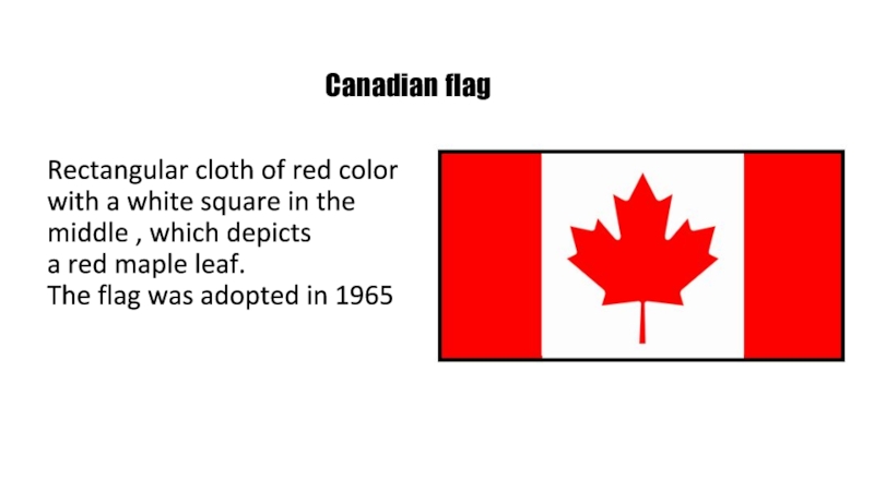 Canadian flag Rectangular cloth of red color with a white square in the middle , which depicts a red maple leaf. The flag was adopted in 1965