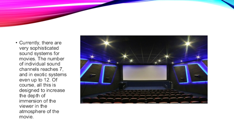 Слайд 9Currently, there are very sophisticated sound systems for movies. The number