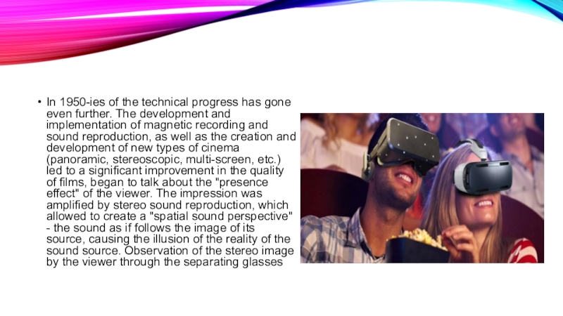 development and implementation of magnetic recording and sound reproduction, as well as the creation and development of new types of cinema (panoramic, stereoscopic, multi-screen, etc.) led to a significant improvement in the quality of films, began to talk about the "presence effect" of the viewer. The impression was amplified by stereo sound reproduction, which allowed to create a "spatial sound perspective" - the sound as if follows the image of its source, causing the illusion of the reality of the sound source. Observation of the stereo image by the viewer through the separating glasses