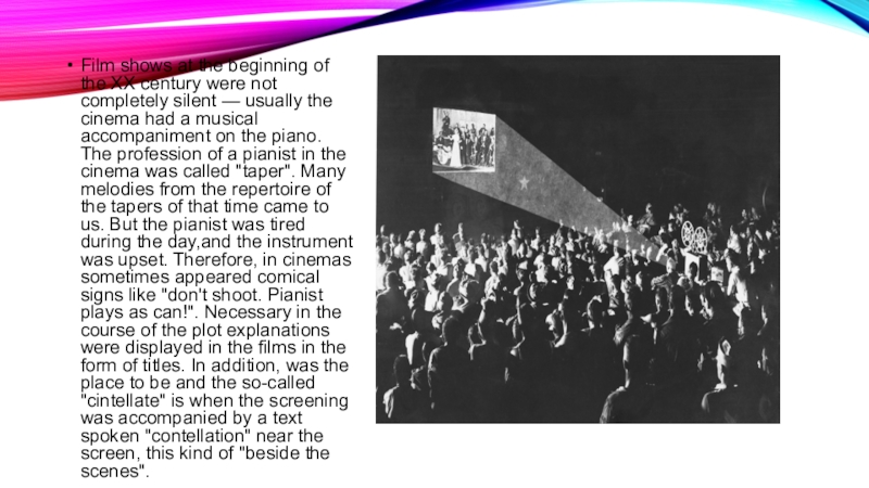 completely silent — usually the cinema had a musical accompaniment on the piano. The profession of a pianist in the cinema was called "taper". Many melodies from the repertoire of the tapers of that time came to us. But the pianist was tired during the day,and the instrument was upset. Therefore, in cinemas sometimes appeared comical signs like "don't shoot. Pianist plays as can!". Necessary in the course of the plot explanations were displayed in the films in the form of titles. In addition, was the place to be and the so-called "cintellate" is when the screening was accompanied by a text spoken "contellation" near the screen, this kind of "beside the scenes".