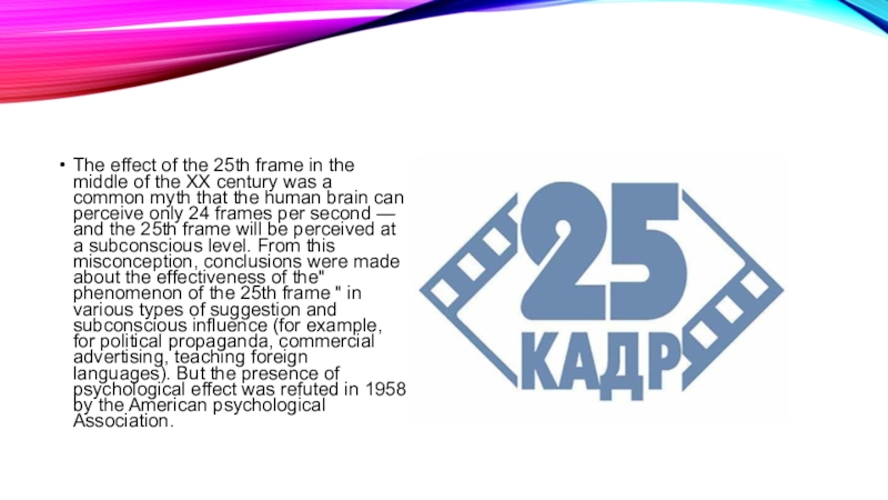 XX century was a common myth that the human brain can perceive only 24 frames per second — and the 25th frame will be perceived at a subconscious level. From this misconception, conclusions were made about the effectiveness of the" phenomenon of the 25th frame " in various types of suggestion and subconscious influence (for example, for political propaganda, commercial advertising, teaching foreign languages). But the presence of psychological effect was refuted in 1958 by the American psychological Association.
