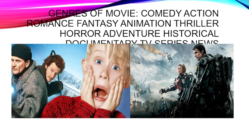 Слайд 12Genres of movie: Comedy action Romance Fantasy Animation Thriller Horror adventure