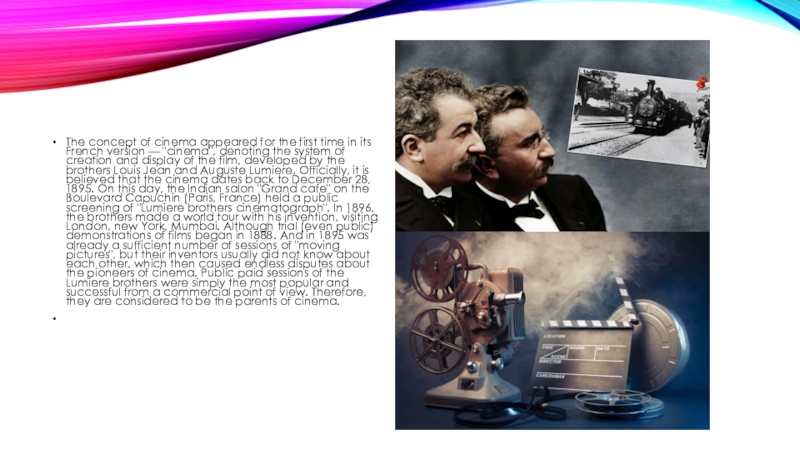 French version — "cinema", denoting the system of creation and display of the film, developed by the brothers Louis Jean and Auguste Lumiere. Officially, it is believed that the cinema dates back to December 28, 1895. On this day, the Indian salon "Grand cafe" on the Boulevard Capuchin (Paris, France) held a public screening of "Lumiere brothers cinematograph". In 1896, the brothers made a world tour with his invention, visiting London, new York, Mumbai. Although trial (even public) demonstrations of films began in 1888. And in 1895 was already a sufficient number of sessions of "moving pictures", but their inventors usually did not know about each other, which then caused endless disputes about the pioneers of cinema. Public paid sessions of the Lumiere brothers were simply the most popular and successful from a commercial point of view. Therefore, they are considered to be the parents of cinema.