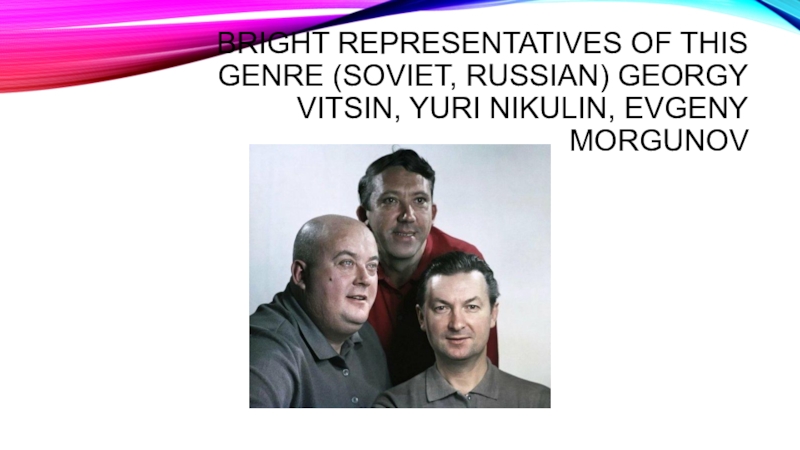 Слайд 13Bright representatives of this genre (Soviet, Russian) Georgy Vitsin, Yuri Nikulin,