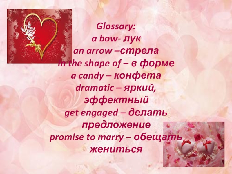 Glossary:a bow- лукan arrow –стрелаin the shape of – в формеa candy – конфетаdramatic – яркий, эффектныйget
