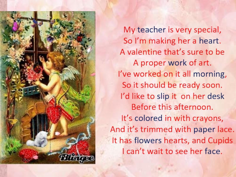 My teacher is very special,So I’m making her a heart.A valentine that’s sure to beA proper work