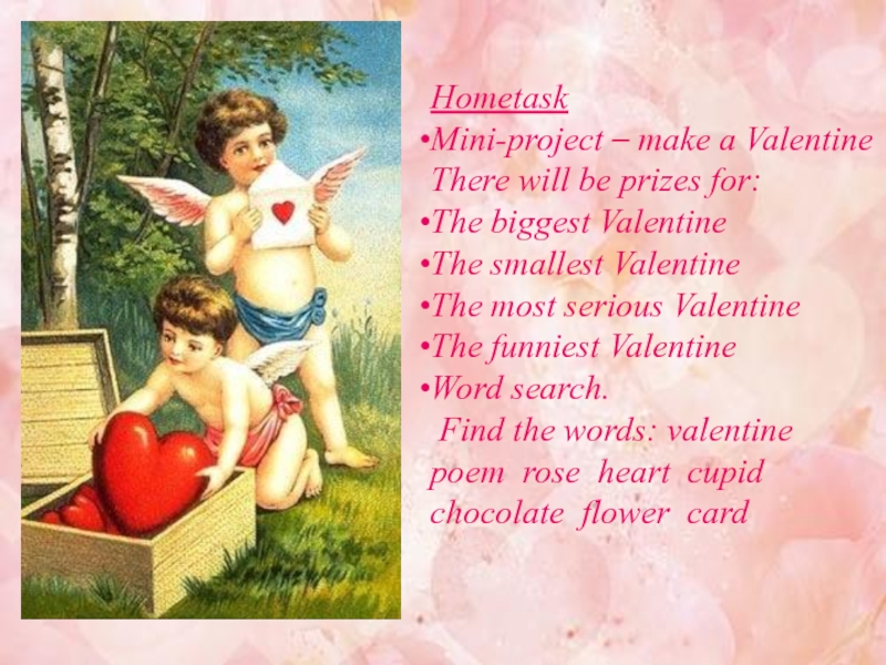 HometaskMini-project – make a ValentineThere will be prizes for:The biggest ValentineThe smallest ValentineThe most serious ValentineThe funniest