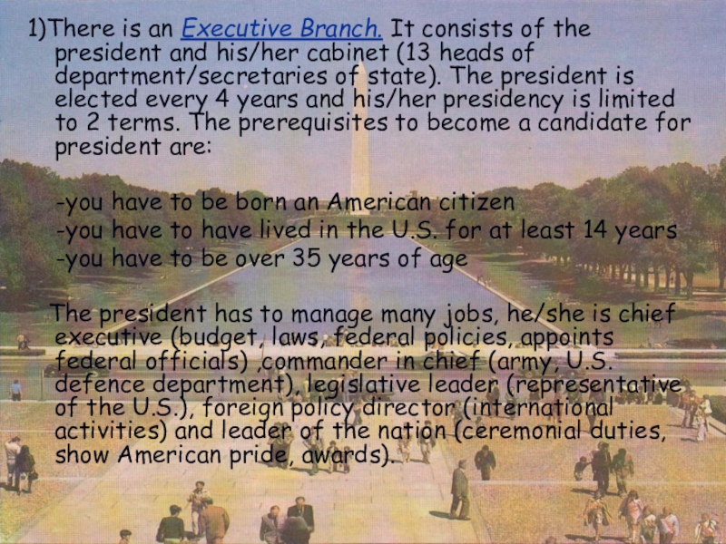 Слайд 181)There is an Executive Branch. It consists of the president and