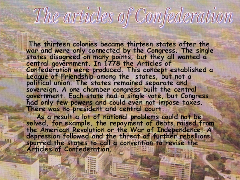 The thirteen colonies became thirteen states after the war and were only connected by the Congress. The single states disagreed on many points, but they all wanted a central government. In 1778 the Articles of Confederation were produced. This concept established a League of Friendship among the states, but not a political union. The states remained separate and sovereign. A one chamber congress built the central government. Each state had a single vote, but Congress had only few powers and could even not impose taxes. There was no president and central court.