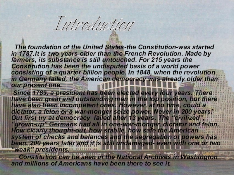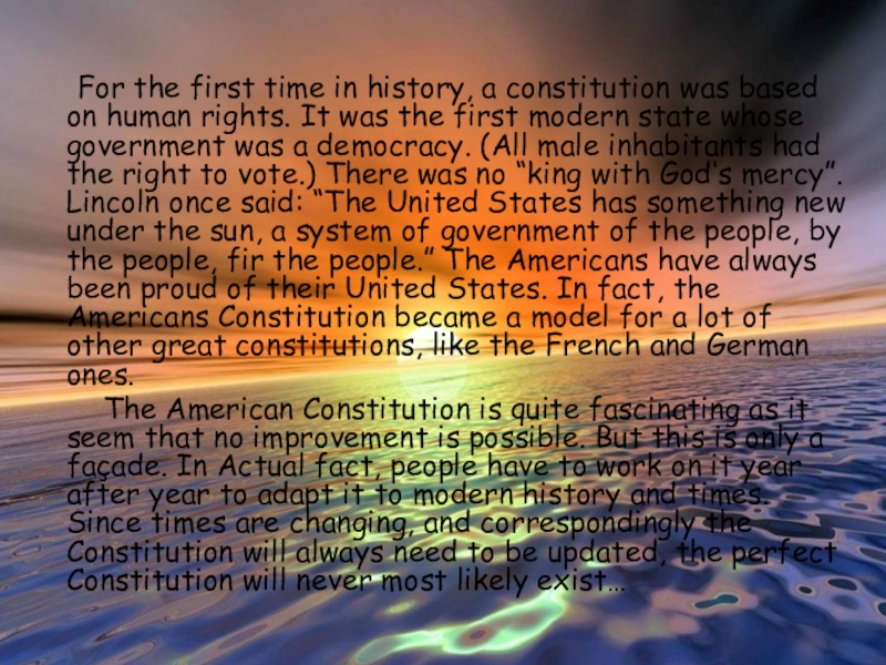 time in history, a constitution was based on human rights. It was the first modern state whose government was a democracy. (All male inhabitants had the right to vote.) There was no “king with God‘s mercy”. Lincoln once said: “The United States has something new under the sun, a system of government of the people, by the people, fir the people.” The Americans have always been proud of their United States. In fact, the Americans Constitution became a model for a lot of other great constitutions, like the French and German ones.