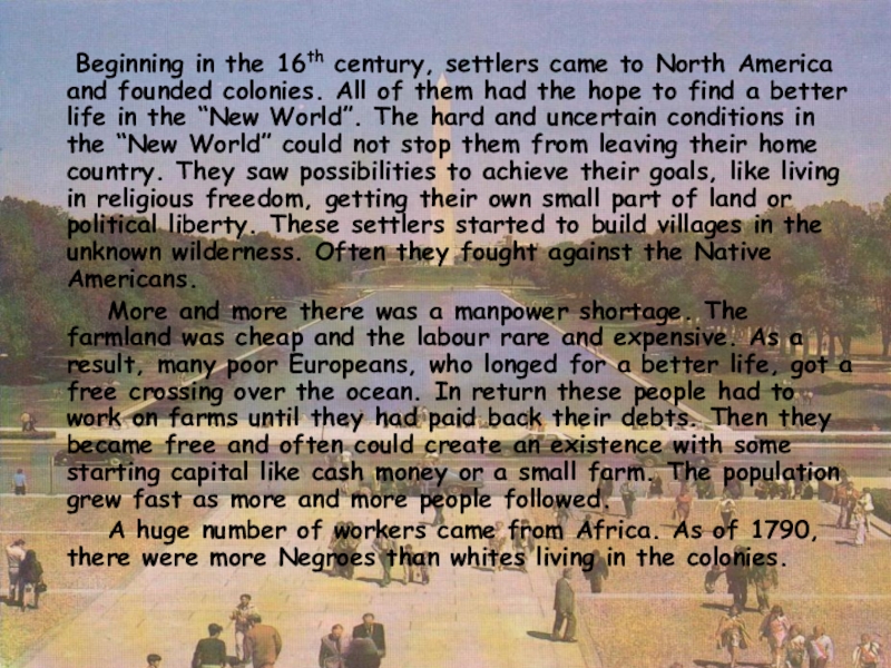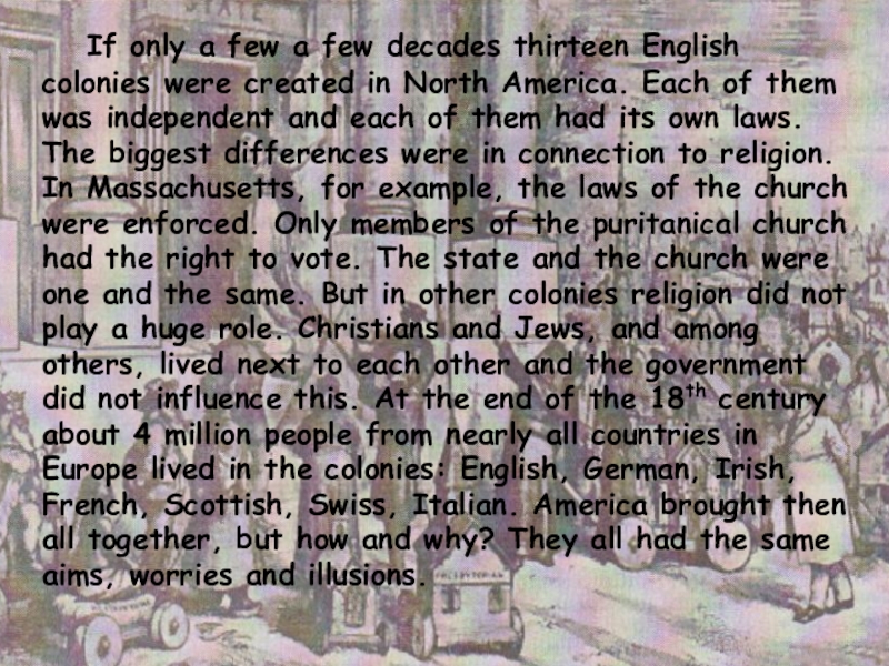 decades thirteen English colonies were created in North America. Each of them was independent and each of them had its own laws. The biggest differences were in connection to religion. In Massachusetts, for example, the laws of the church were enforced. Only members of the puritanical church had the right to vote. The state and the church were one and the same. But in other colonies religion did not play a huge role. Christians and Jews, and among others, lived next to each other and the government did not influence this. At the end of the 18th century about 4 million people from nearly all countries in Europe lived in the colonies: English, German, Irish, French, Scottish, Swiss, Italian. America brought then all together, but how and why? They all had the same aims, worries and illusions.