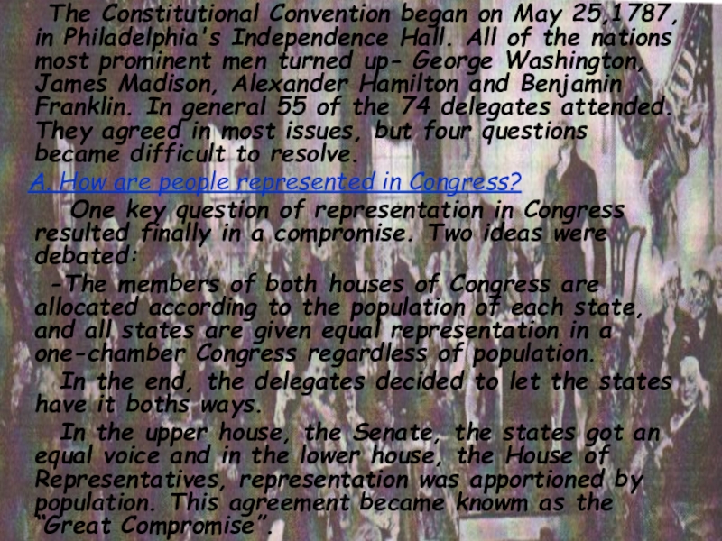 began on May 25,1787, in Philadelphia's Independence Hall. All of the nations most prominent men turned up- George Washington, James Madison, Alexander Hamilton and Benjamin Franklin. In general 55 of the 74 delegates attended. They agreed in most issues, but four questions became difficult to resolve.