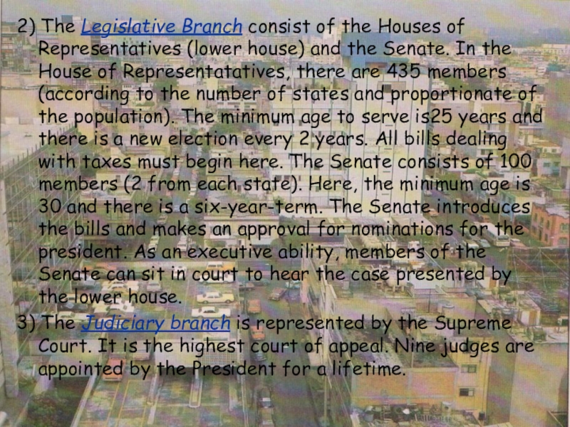 Слайд 192) The Legislative Branch consist of the Houses of Representatives (lower