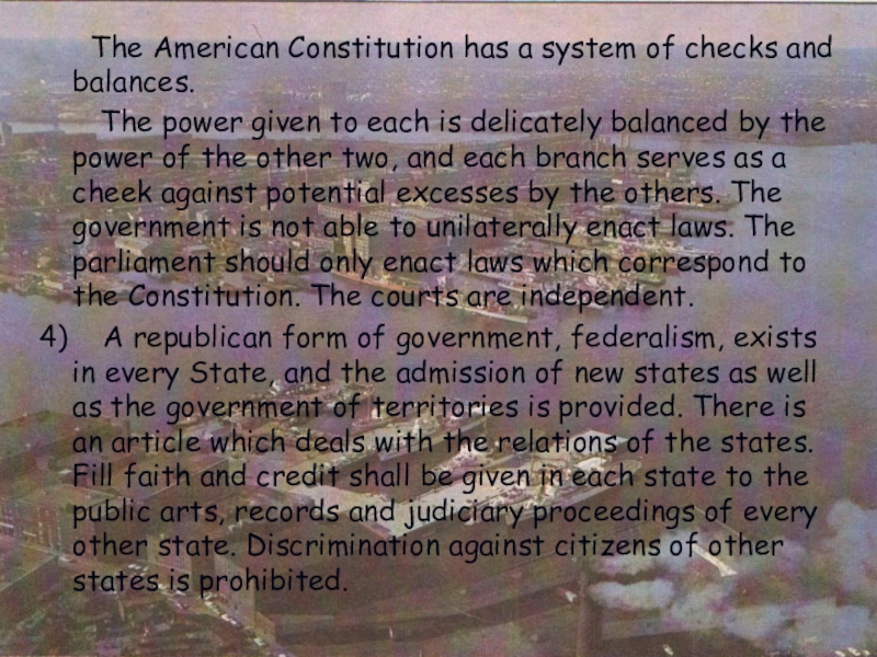 4) A republican form of government, federalism, exists in every State, and the admission of new states as well as the government of territories is provided. There is an article which deals with the relations of the states. Fill faith and credit shall be given in each state to the public arts, records and judiciary proceedings of every other state. Discrimination against citizens of other states is prohibited.