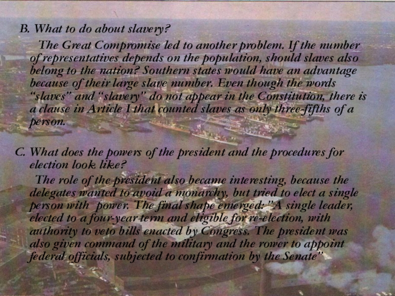 The role of the president also became interesting, because the delegates wanted to avoid a monarchy, but tried to elect a single person with power. The final shape emerged: ”A single leader, elected to a four-year term and eligible for re-election, with authority to veto bills enacted by Congress. The president was also given command of the military and the rower to appoint federal officials, subjected to confirmation by the Senate”