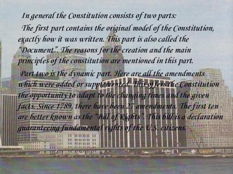 The first part contains the original model of the Constitution, exactly how it was written. This part is also called the “Document”. The reasons for the creation and the main principles of the constitution are mentioned in this part.