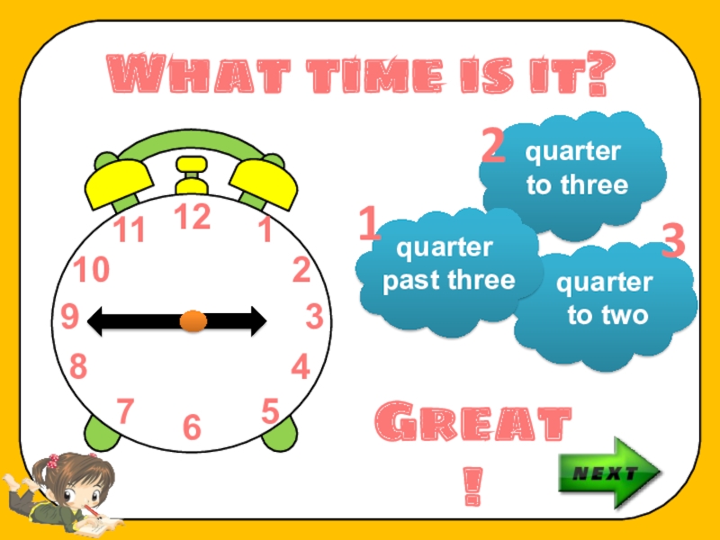 What time is it?quarter to threequarter to twoquarter past threeGreat!123