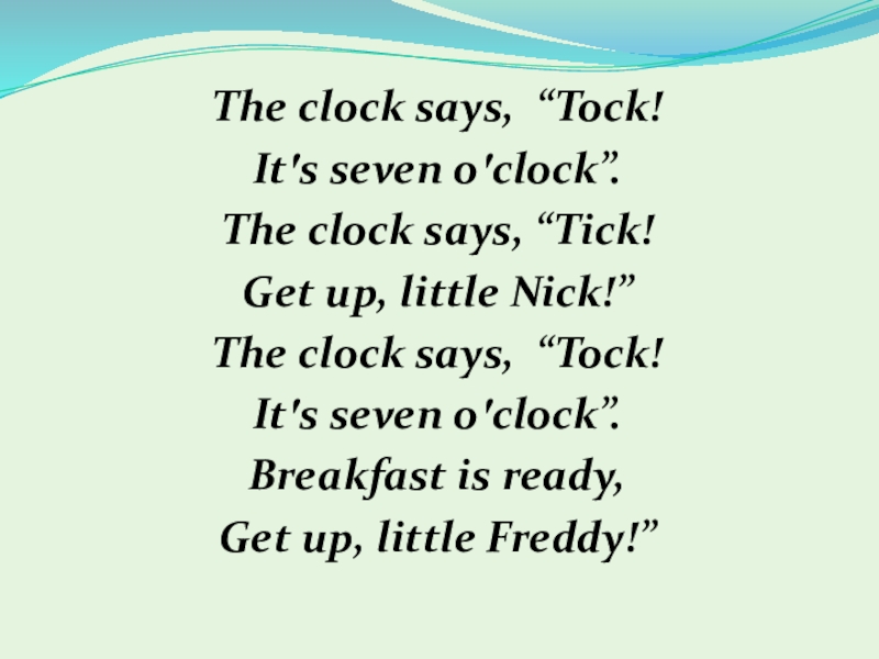 The clock says, “Tock!Itꞌs seven oꞌclock”.The clock says, “Tick!Get up, little Nick!”The clock says, “Tock!Itꞌs seven oꞌclock”.Breakfast